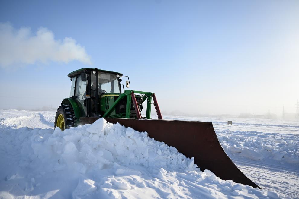 12月19日,在内蒙古呼伦贝尔市鄂温克族自治旗伊敏苏木,苏木工作人员驾驶大型机械清理牧区道路积雪。新华社记者贝赫 摄