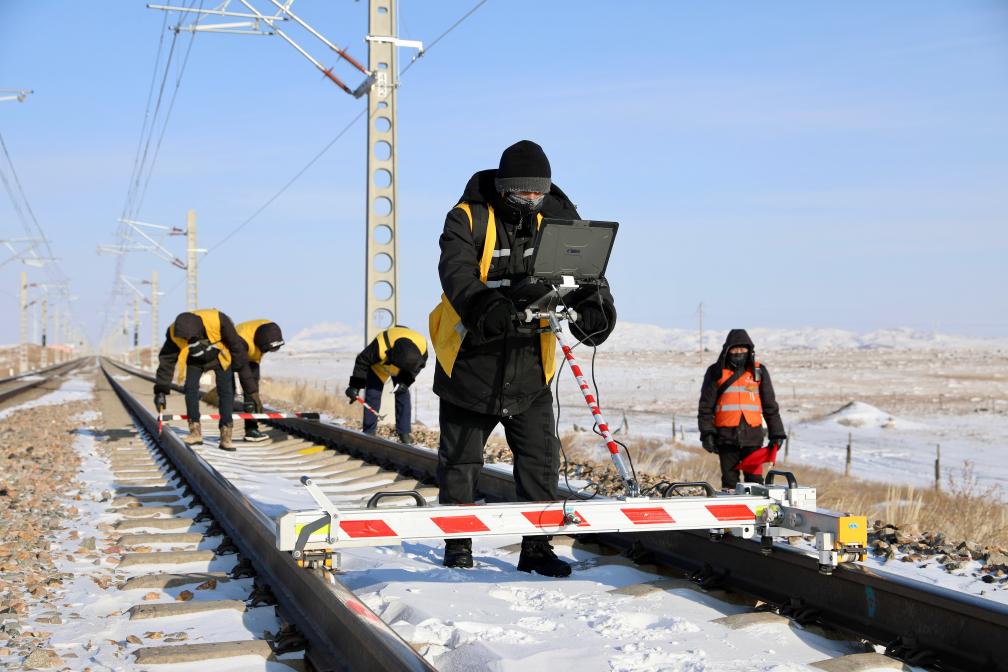 铁路职工在零下30摄氏度的低温环境下养护铁路线,保障能源通道运输安全畅通。(中国铁路呼和浩特局集团有限公司供图)