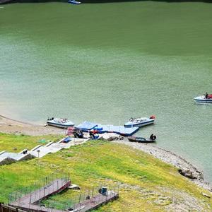 8月24日,游客在黄河老牛湾乘快艇游玩(无人机照片)。