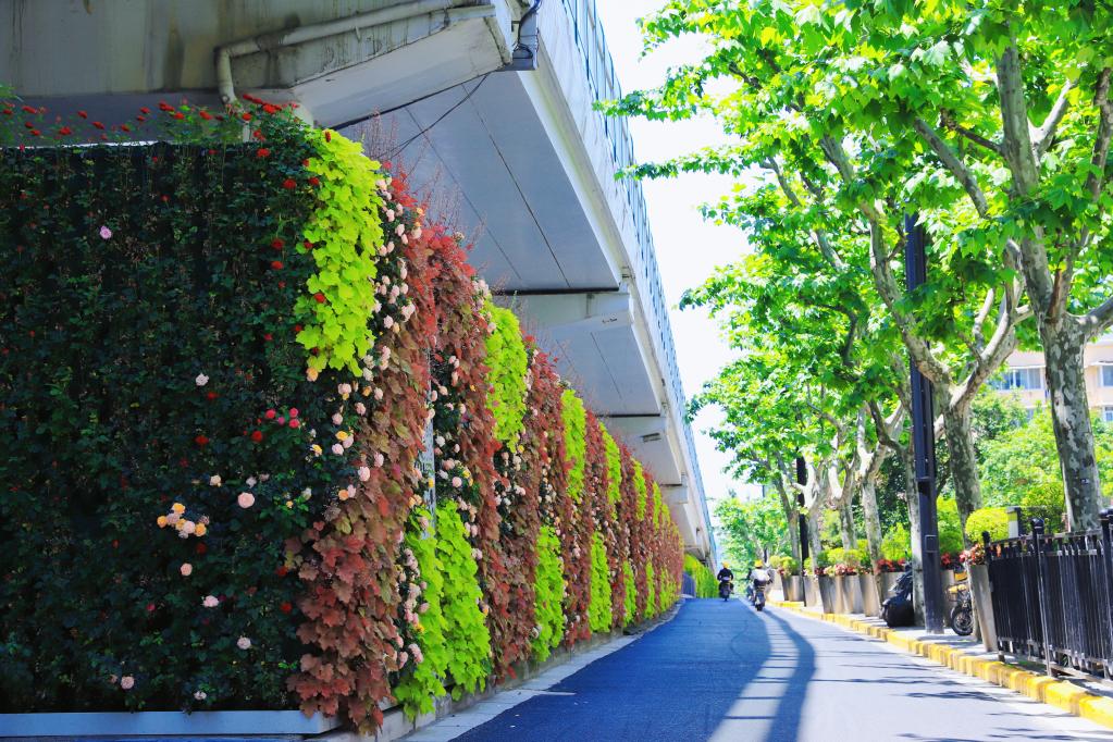上海一处高架桥下的立体绿化。(上海市绿化和市容管理局供图)