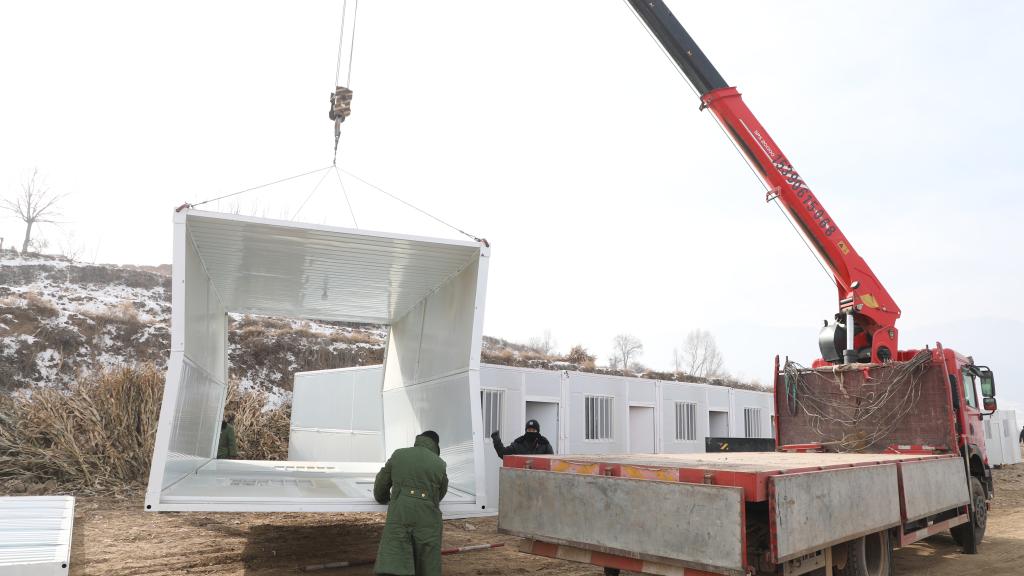 12月23日,甘肃建投建设有限公司的工作人员在积石山县刘集乡阳洼村吊装活动板房。新华社记者张智敏 摄