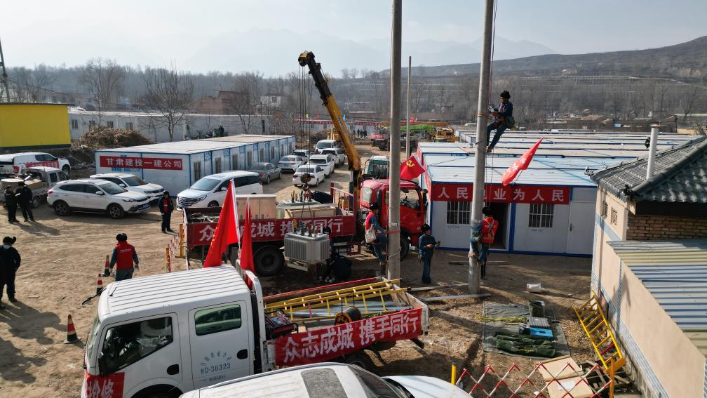 12月23日,在刘集乡陶家村集中安置点,国网白银供电公司抢修组的工作人员正在安装变压器(无人机照片)。新华社记者张智敏 摄