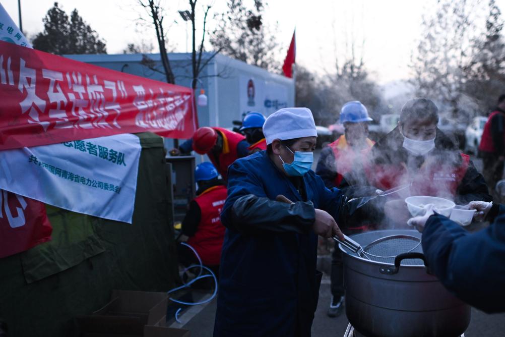 12月22日,在青海省海东市民和回族土族自治县官亭镇喇家村安置点,工作人员为安置点群众盛饺子。