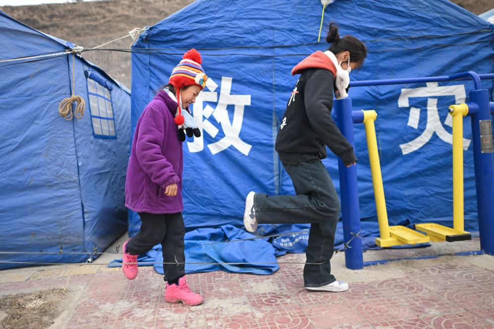 12月22日,在青海省海东市循化撒拉族自治县道帏藏族乡牙木村安置点,两名小朋友在跳皮筋。