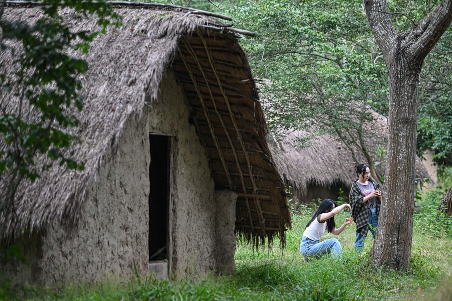 游客在海南省东方市江边乡白查村参观船型屋(12月6日摄)。新华社记者 蒲晓旭 摄