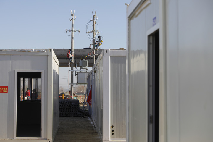 12月27日,在积石山县吹麻滩镇集中安置点,国家电网工作人员在对安置点进行通电作业。新华社记者 方欣 摄