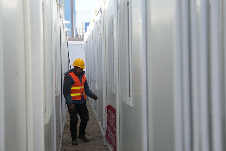 12月27日,在积石山县吹麻滩镇集中安置点,甘肃省公航旅集团施工人员在检查板房情况。新华社记者 陈斌 摄