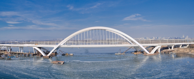 作为京雄高速全线控制性工程,京雄大桥已于2023年6月17日实现合龙,一举刷新北京桥梁单跨跨度纪录。桥梁采用飞燕式拱桥结构,拱顶以“中国结”造型的风撑连接,寓意北京与雄安两座城市紧密联系、协同发展。
