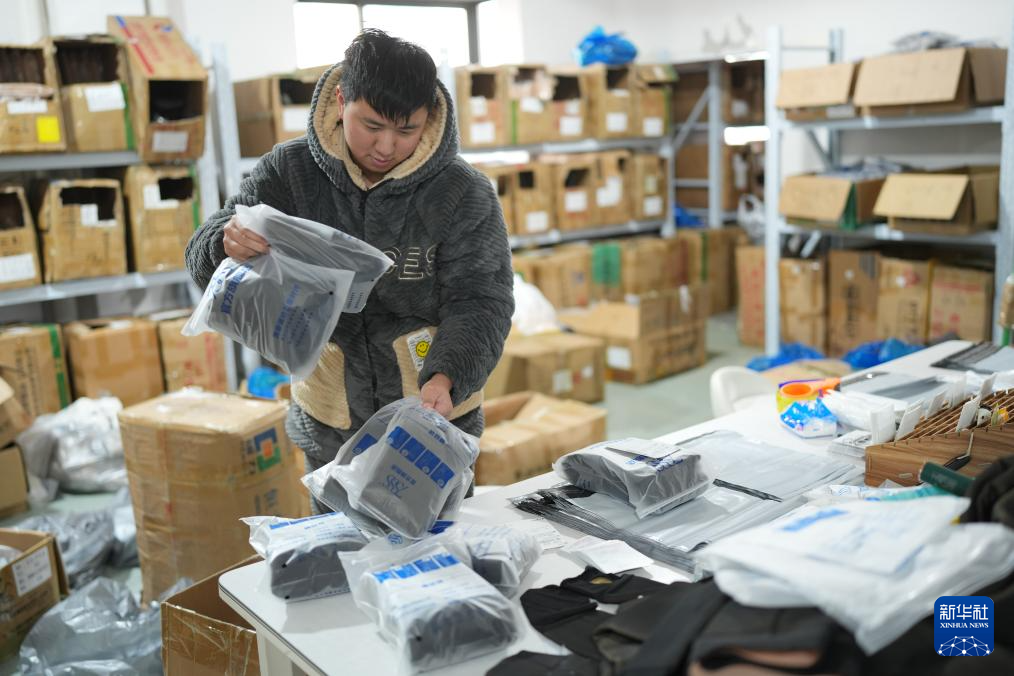 12月28日,在天台县白鹤镇,26岁的本地创业者鲍启辉在打包通过直播间销售的服饰。