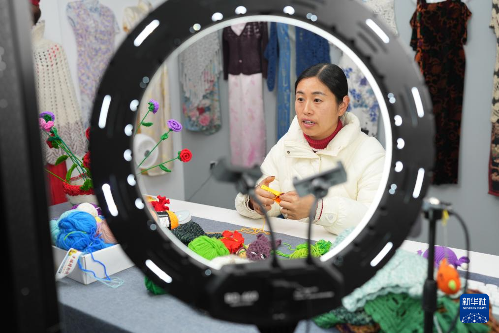 12月28日,在天台县赤城街道塔后村,村民范玲敏在村里搭建的共富直播间直播手工编织。