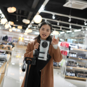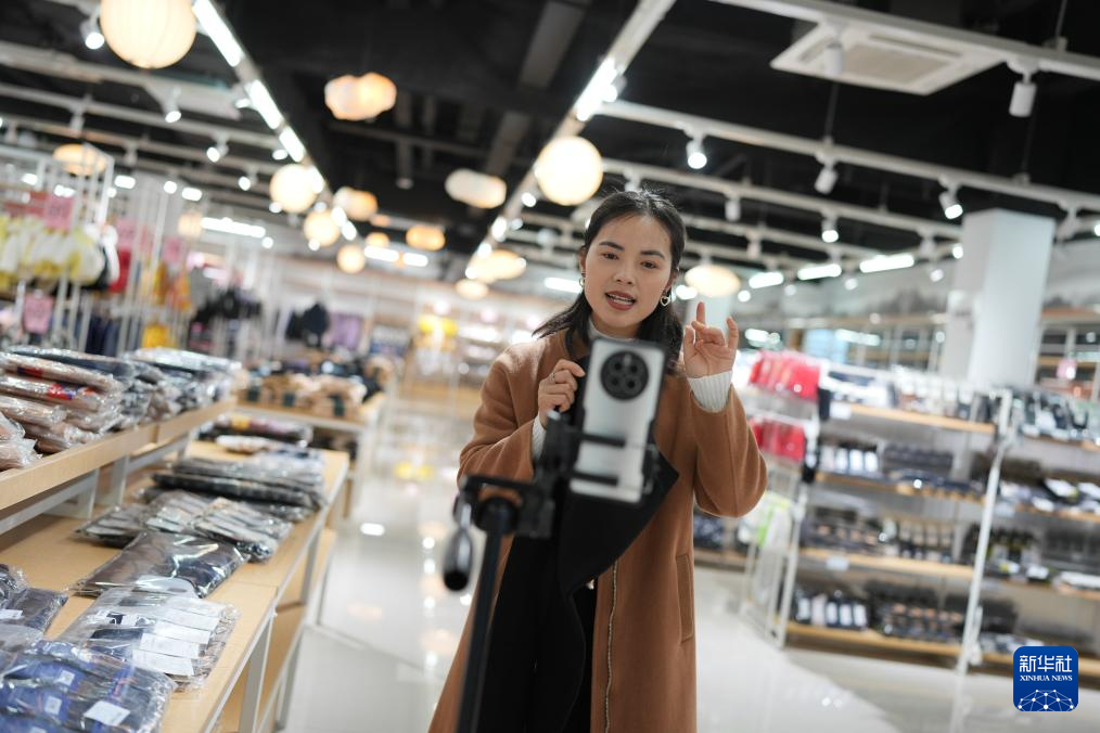 12月28日,在天台县白鹤镇白鹤国际袜业城,村民范银燕在园区超市走播,介绍园区内商家精选产品。