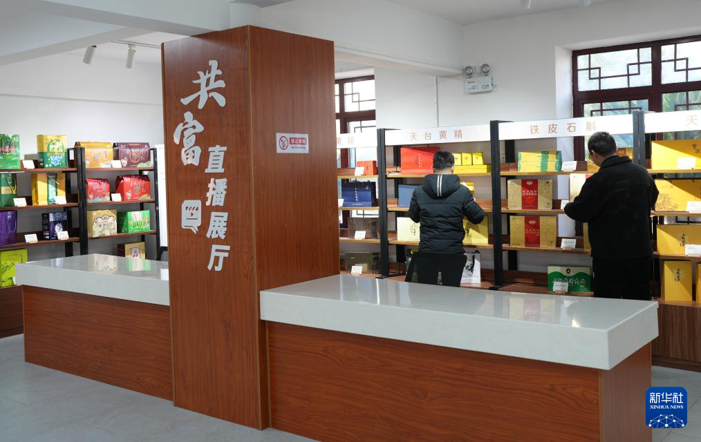 12月28日,工作人员在天台县赤城街道塔后村共富直播展厅整理当地特色农产品。