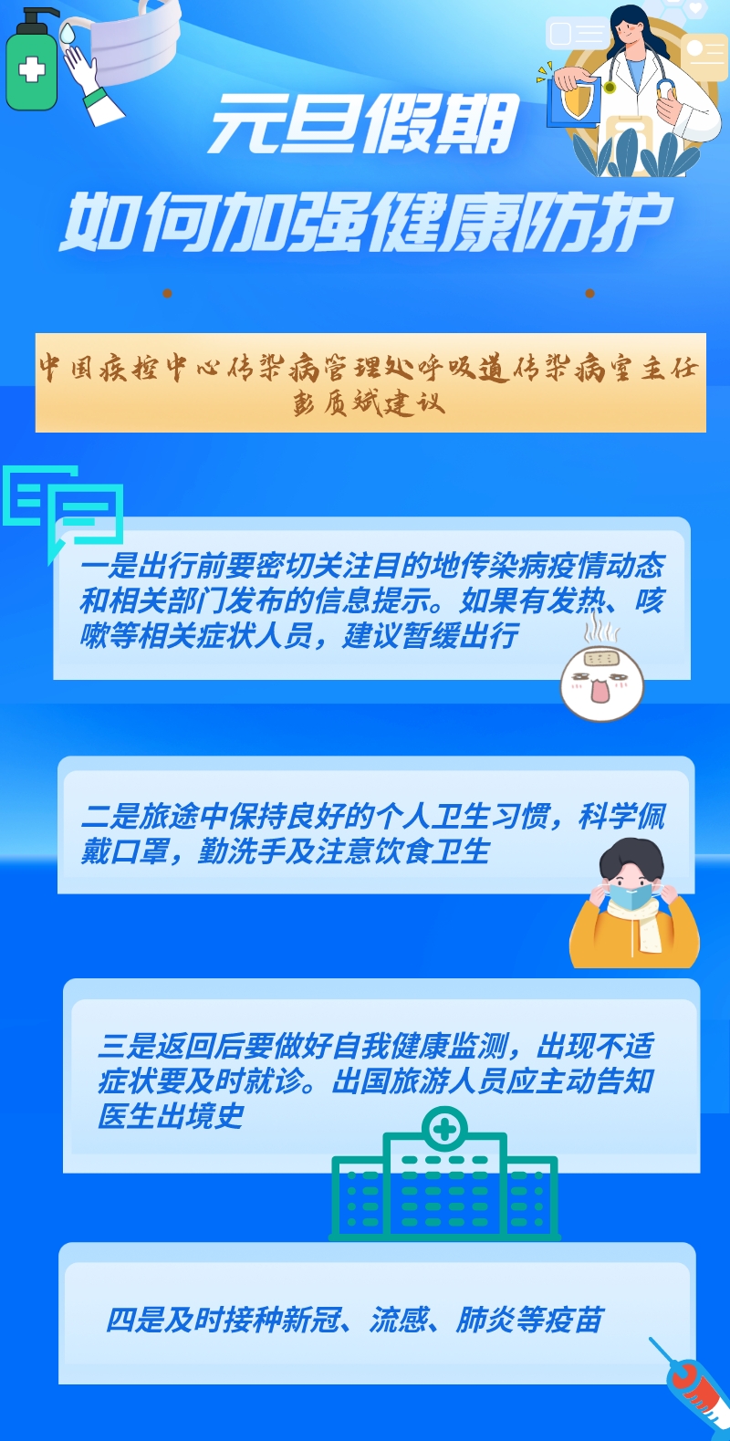 元旦假期中,人员流动增多,探亲访友、旅游出行、聚会聚餐等增加,呼吸道疾病传播风险加大,做好健康防护至关重要。