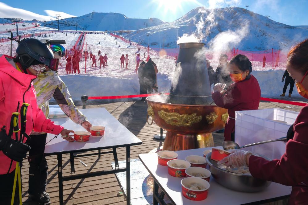 12月22日,游客在新疆阜康市天山天池国际滑雪场领取景区免费提供的冬至饺子。新华社记者 张铖 摄