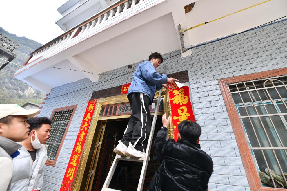 ↑在大化瑶族自治县板升乡弄勇村弄顶屯,蒙宣汰(上)在贴对联(2023年1月21日摄)。
