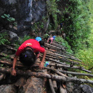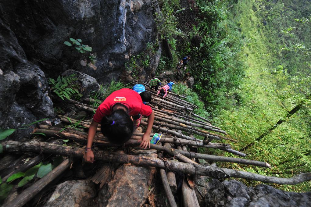 ↑在大化瑶族自治县板升乡弄勇村弄顶屯,二年级学生蒙宣汰(从上至下第三个)爬“天梯”去学校(2012年9月3日摄)。