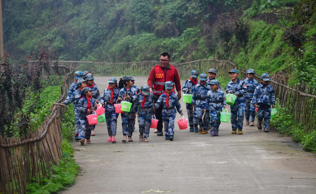 ↑在乌英苗寨,打扫卫生结束后,郑昌昊带着孩子们返回教室(2021年4月9日摄)。