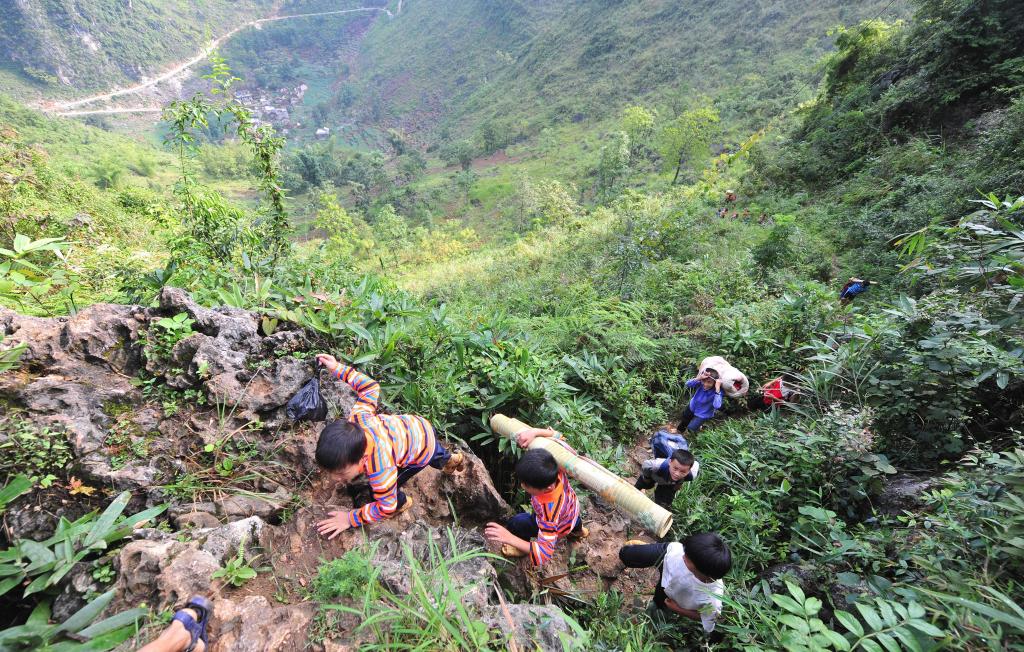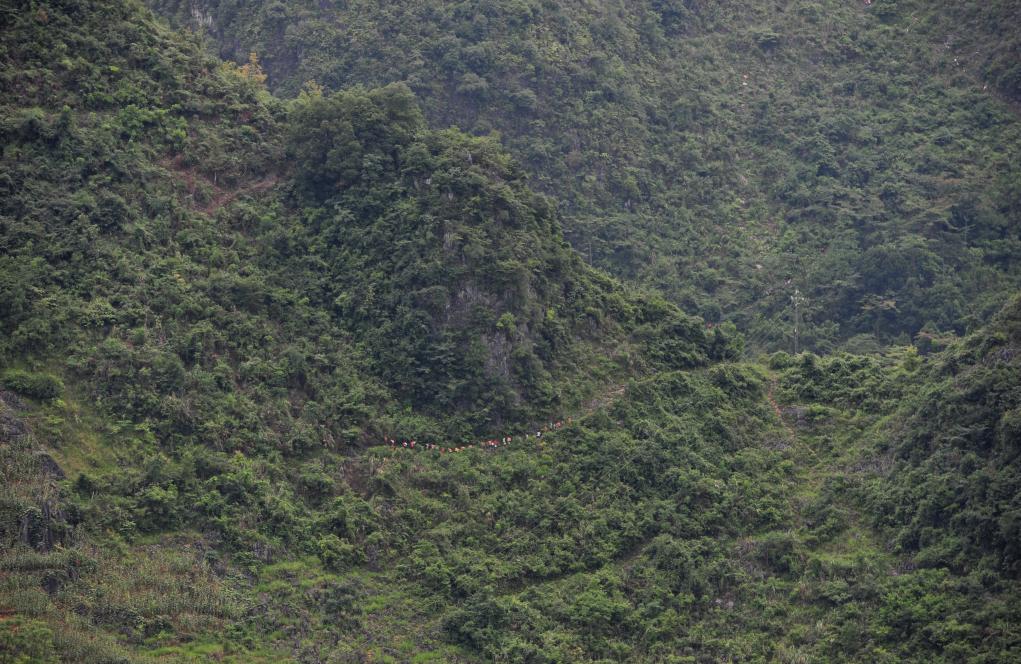 ↑2012年9月3日,在大化瑶族自治县板升乡弄勇村,蒙宣汰(左一)、蒙宣任(左二)爬山路去学校。