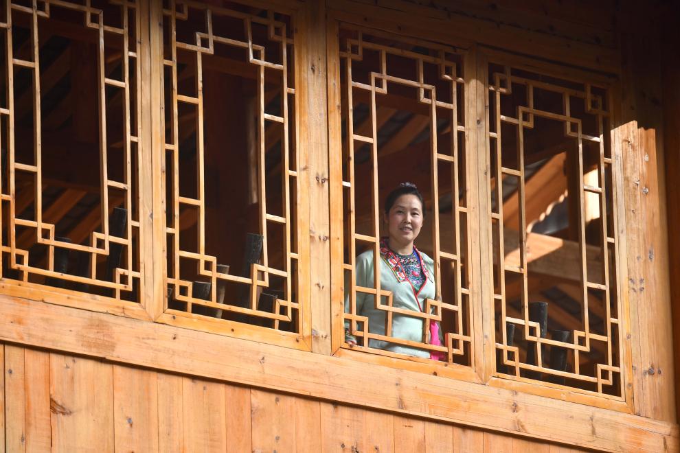 ↑一名乌英苗寨村民从风雨楼里看窗外的风景(2023年10月4日摄)。