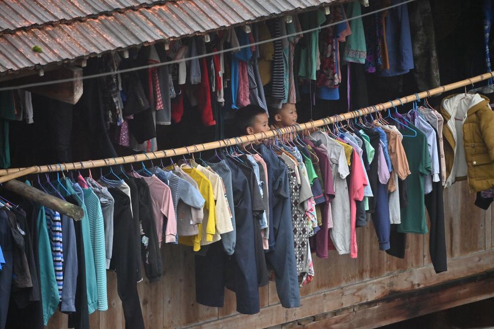 ↑在乌英苗寨,两个小朋友在看窗外的风景(2023年10月14日摄)。
