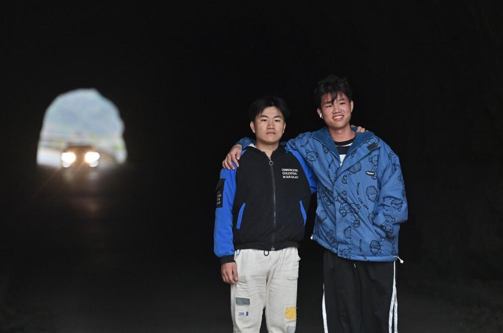 ↑2023年1月20日,在大化瑶族自治县板升乡弄勇村,22岁的蒙宣任(左)和弟弟蒙宣汰站在通往弄勇小学的隧道旁合影,隧道上方是他们儿时上学需要攀爬的“天梯”。蒙宣任目前在辽宁省交通高等专科学校读书,弟弟蒙宣汰从技校毕业后在广东一家汽修厂上班。