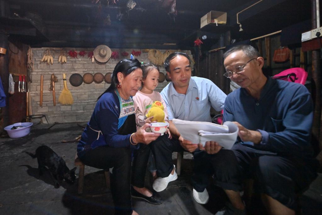 ↑在乌英苗寨,村民梁安合(右一)在修改夜校课程教材(2023年9月7日摄)。
