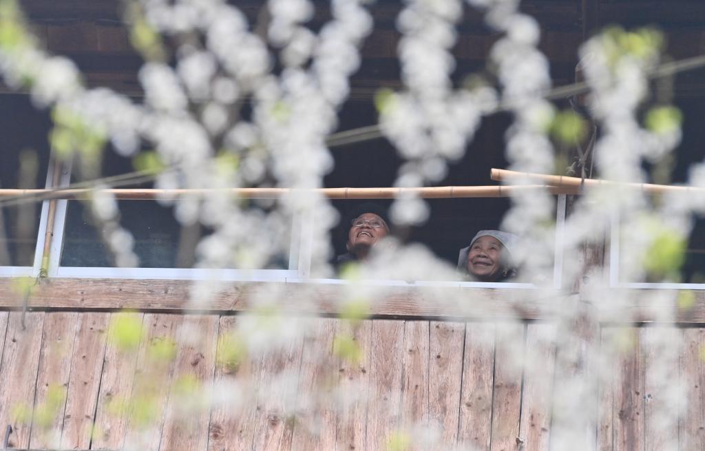 ↑乌英苗寨老人梁安合(左)和老伴在看窗外的风景(2023年2月26日摄)。