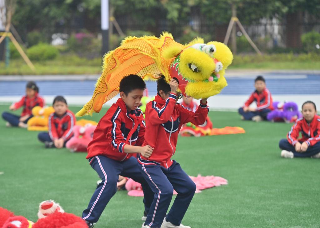 ↑2023年11月29日,在梧州市工厂路小学,学生们在非遗课上练习舞狮。