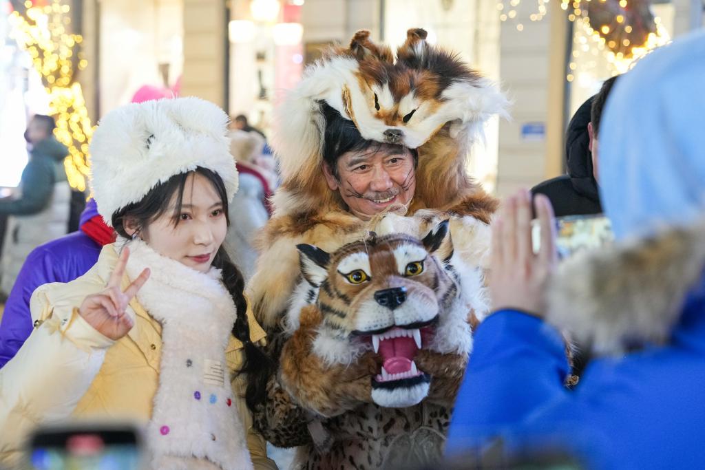游客在哈尔滨市道里区中央大街游玩(1月3日摄)。新华社记者 谢剑飞 摄