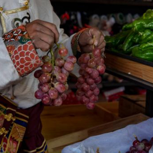 申扎县马跃乡贝嘎四村偏远乡镇果蔬配送试点项目直销点店主西热加措在整理供销合作社配送来的新鲜红提(1月5日摄)。新华社记者 旦增尼玛曲珠 摄