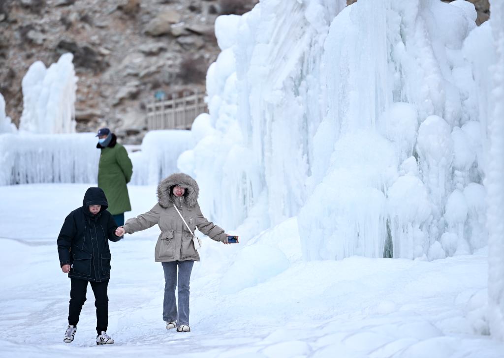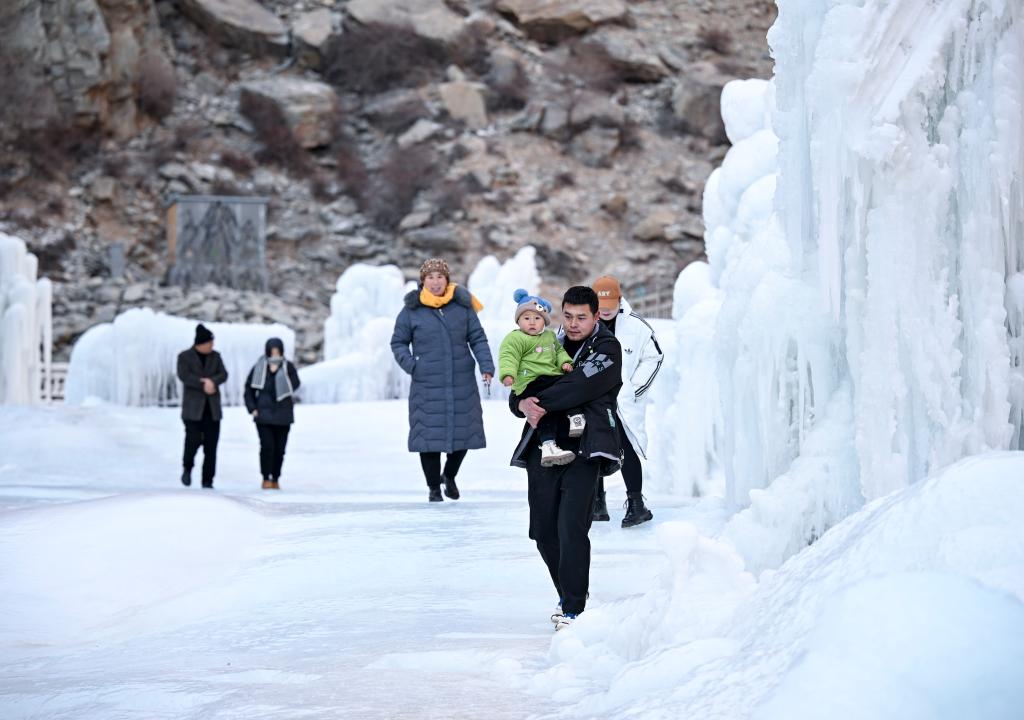 1月5日,游客在宁夏贺兰山岩画景区观赏冰瀑景观。