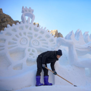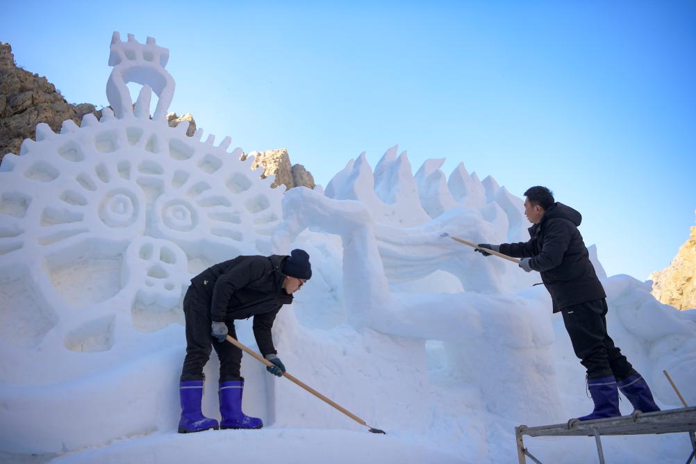 1月5日,工作人员在宁夏贺兰山岩画景区结合“太阳神”岩画制作雪雕。
