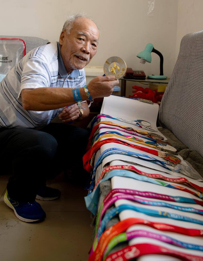 郑承端向记者展示其获得的马拉松完赛奖牌。新华社记者 魏培全 摄
