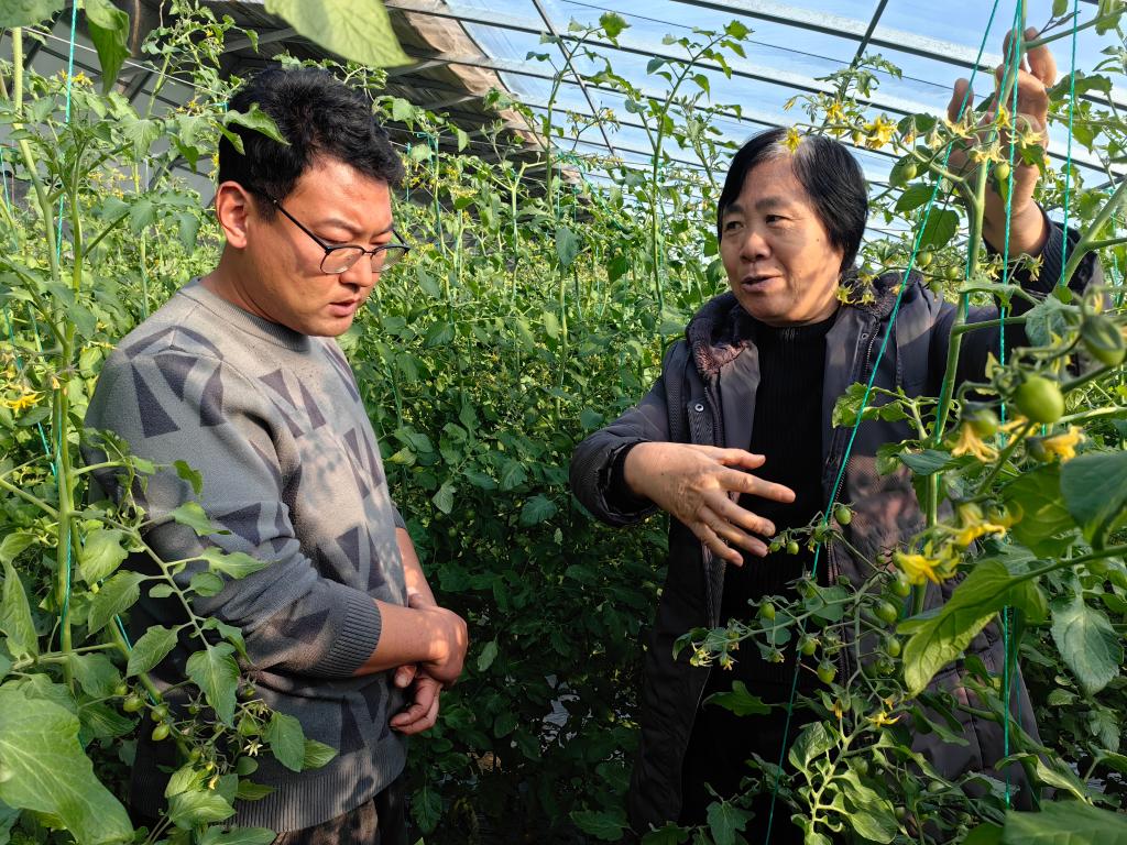 杜立芝(右)在为种植户提供技术指导。新华社记者张力元 摄