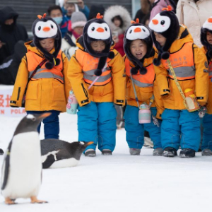 1月6日,11名来自广西南宁的小朋友——“小砂糖橘”结束漠河游学之旅,来到哈尔滨极地公园,与企鹅亲密互动。新华社记者张涛 摄