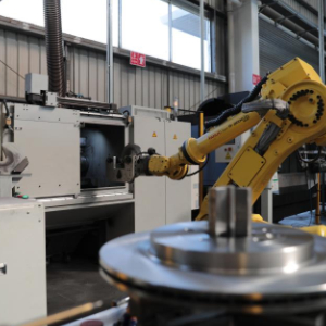 在摩擦一号制动科技(仙桃)有限公司三号工厂里,机器人在制作刹车盘。(张勋 摄)