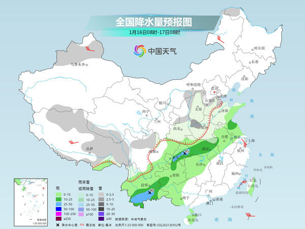 明天,随着暖湿气流继续增强,南方降雨还将发展。预计,辽东半岛、河北东北部、山西北部、山东中北部、新疆北部、西藏中南部、青海南部、川西高原大部、陕西西南部、河南南部等地部分地区有小到中雪或雨夹雪,其中,新疆沿天山地区和伊犁河谷、西藏东南部等地局地有大雪。江淮大部、江南北部和西部、江汉、西南地区东部和南部、广西中西部等地部分地区有小到中雨,其中,湖北南部、湖南北部、贵州东北部、重庆东南部等地局地有大到暴雨。