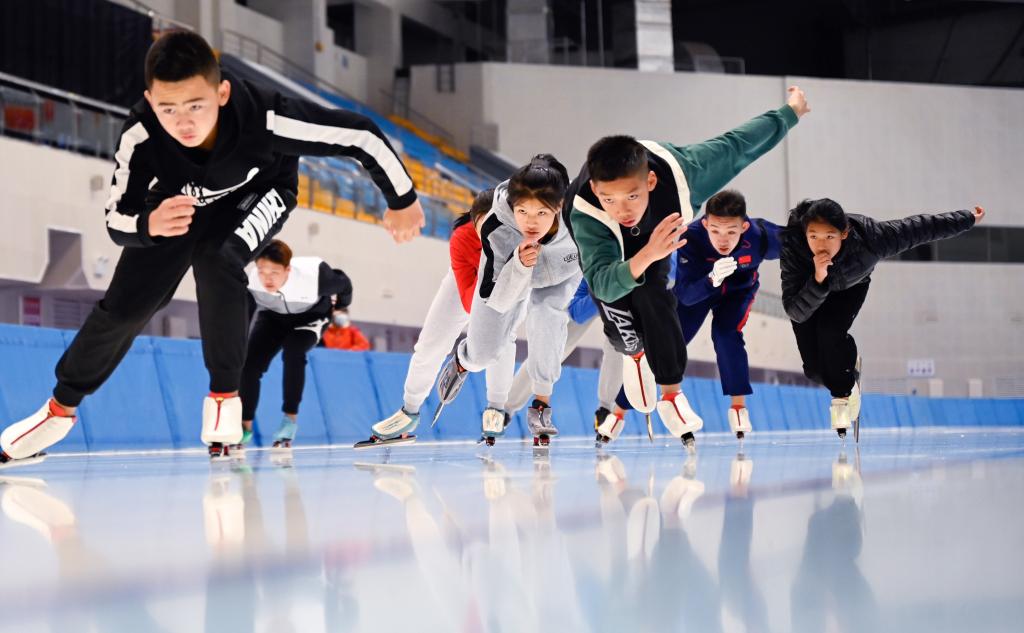 呼伦贝尔学院冰雪运动专业学生正在进行滑冰训练。新华社记者 贺书琛 摄