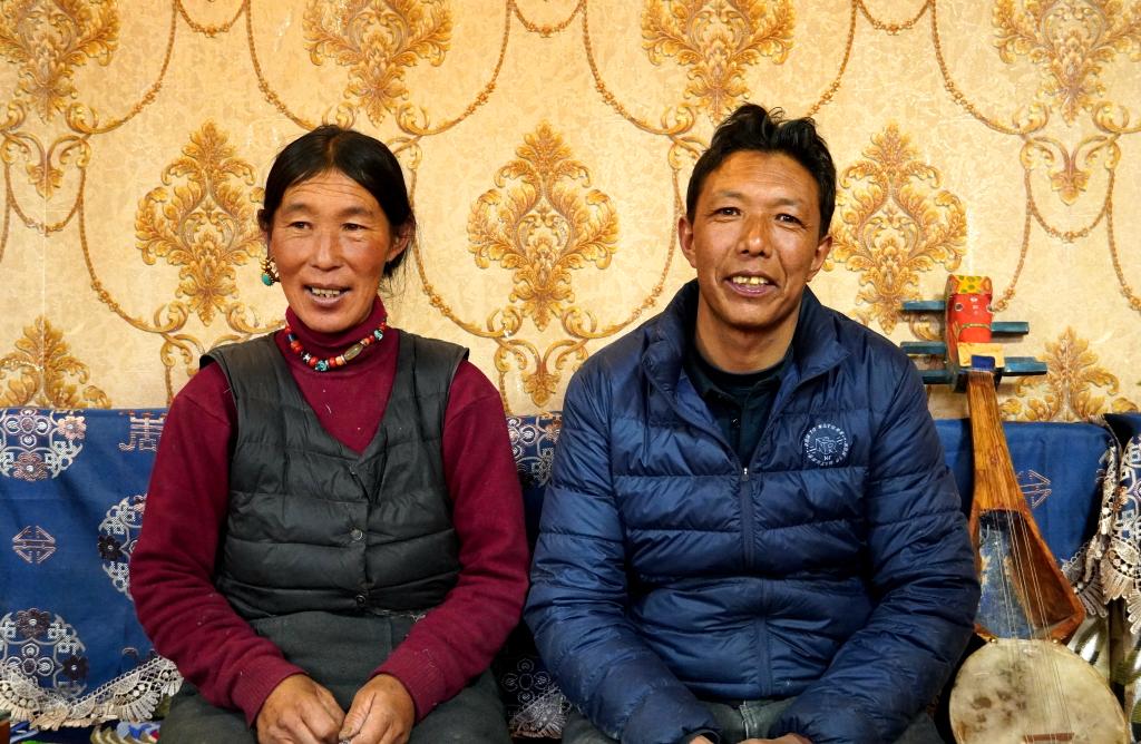 札达县楚鲁松杰乡巴卡村巴角组村民欧珠多吉夫妇在新房客厅合影(1月14日摄)。新华社记者陈尚才 摄
