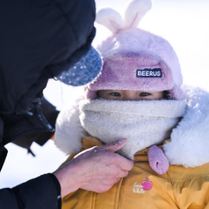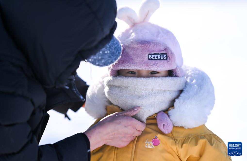 1月19日,在内蒙古呼伦贝尔市海拉尔河西新区一处公园,一位家长给孩子戴围巾。新华社记者 连振 摄
