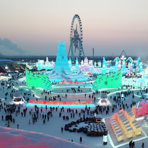 晶莹剔透的冰块雕刻而成的天坛、巴黎圣母院等建筑艺术景观群流光溢彩,让来自全国各地的游客大饱眼福。超级冰滑梯备受游客追捧,很多游客不惜排队数小时也要体验一番“速度与激情”。