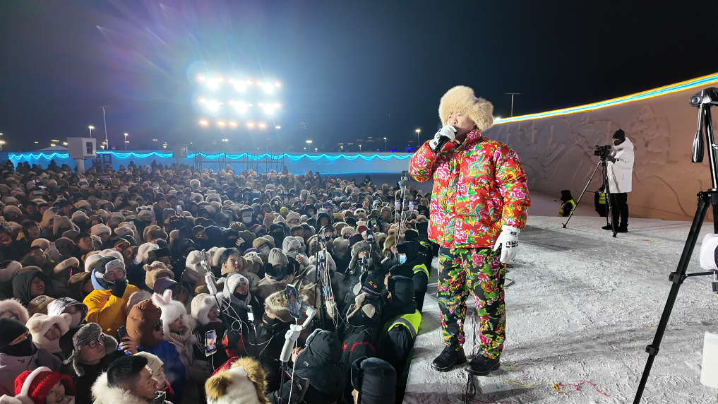 “左右哥”在哈尔滨冰雪大世界梦想大舞台主持。新华社记者 张启明 摄