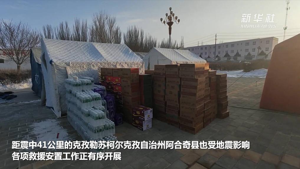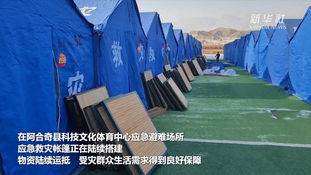 在阿合奇县科技文化体育中心应急避难场所,应急救灾帐篷正在陆续搭建,物资陆续运抵,受灾群众生活需求得到良好保障。