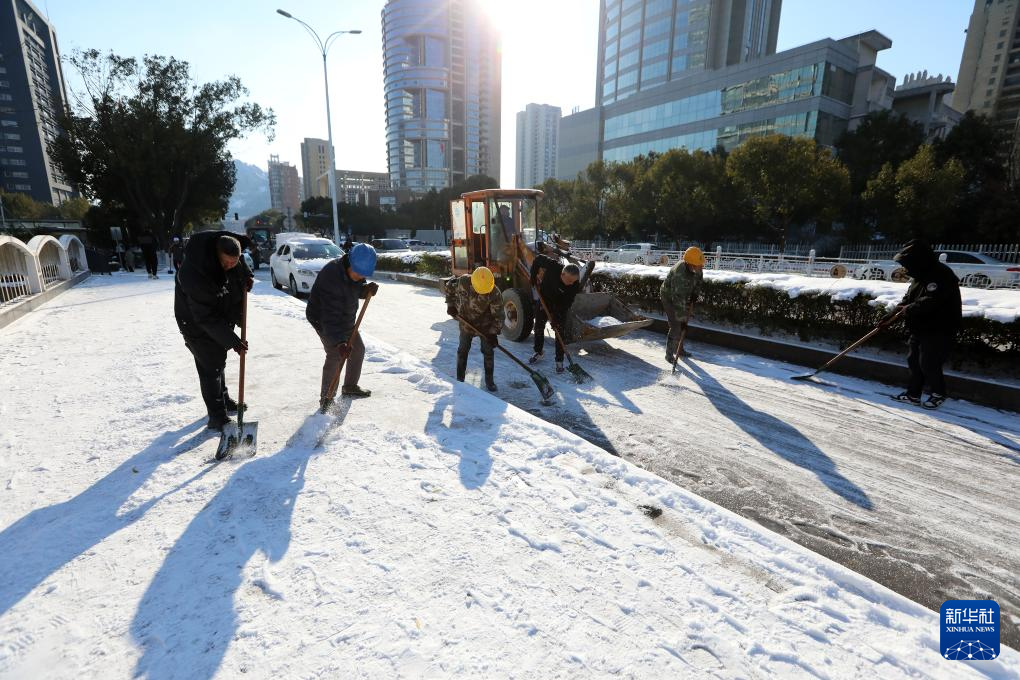 1月23日,在浙江省温岭市,人们在清除路面冰雪。近日,受寒潮天气影响,我国多地迎来降温降雪天气,各地积极组织相关部门开展抗凝除雪工作,保安全保畅通。新华社发(周学军摄)