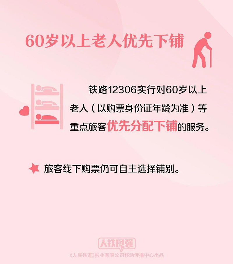 在票量充足的情况下,系统自动识别60岁以上的老年旅客并优先安排下铺。如果是多人同行一份订单,系统也会自动分配相邻铺位。