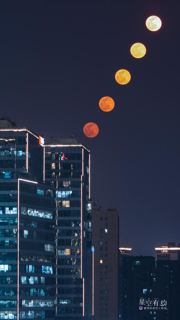 湖北星空摄影爱好者周全2022年1月18日在湖北武汉拍摄的当年第一次满月(多张叠加)。(本人供图)