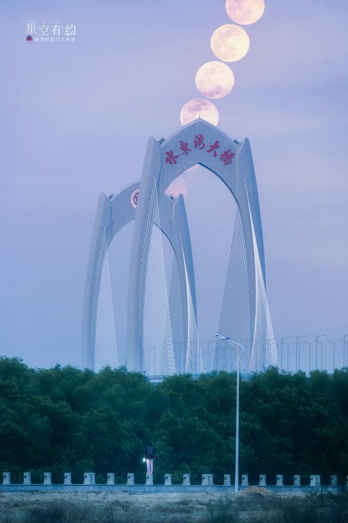 广东星空摄影爱好者欧明威2023年1月6日在广东茂名水东湾海洋公园拍摄的当年第一次满月(多张叠加)。(本人供图)