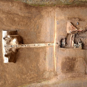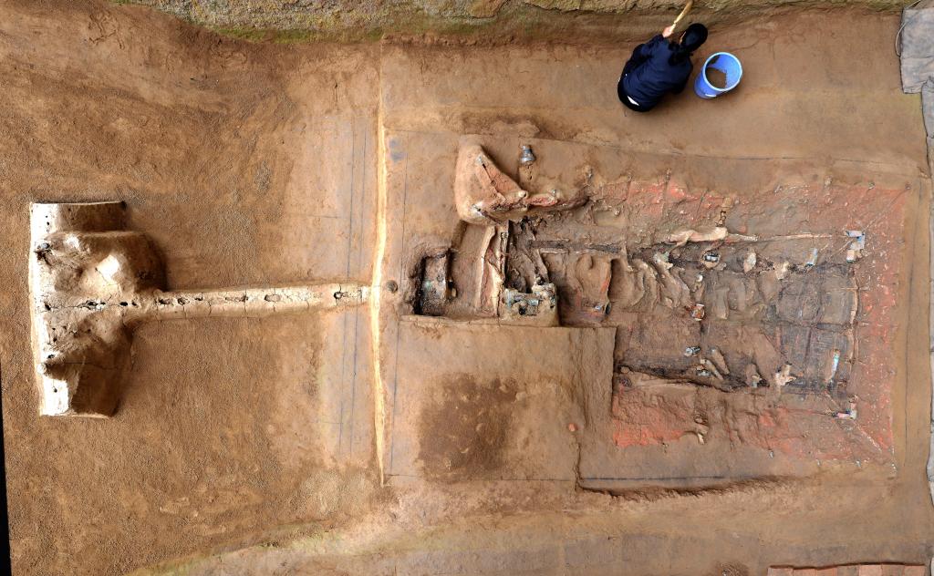 其中,墓室中心棺椁塌陷、朽坏严重,考古工作者将主棺椁整体打包提取到实验室进行清理。墓内出土大量陶器、铜器、玉器、铁器以及金银质地的小型明器。考古工作者还在直通墓底的北墓道清理出一辆四轮独辀木车,木车遗迹保存完整,总长约7.2米,方形彩绘车盖、铜构件等均保存完整。在陪葬坑中发现木车残迹、动物遗迹、青铜车马器等。