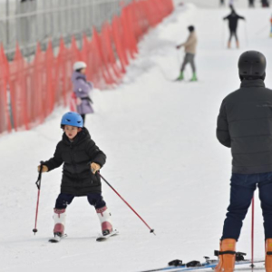 游客在位于罗庄子镇的蓟州溶洞景区冰雪世界体验滑雪。新华社记者宋为伟 摄