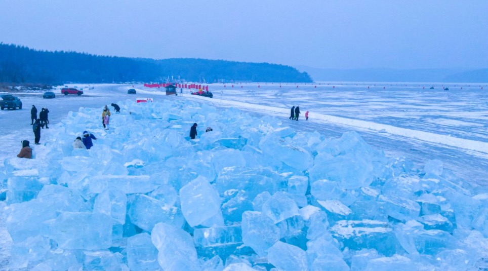 说来有趣,这些原本是净月潭冰雕师们没用完的冰雕原材料,堆放在一起,蔚为壮观,又因净月潭水质优良,大冰块又晶莹剔透,又带着淡淡的蓝色,在长春浓度极高的蓝色天空之下,仿佛一片结了冰的“蓝海”。